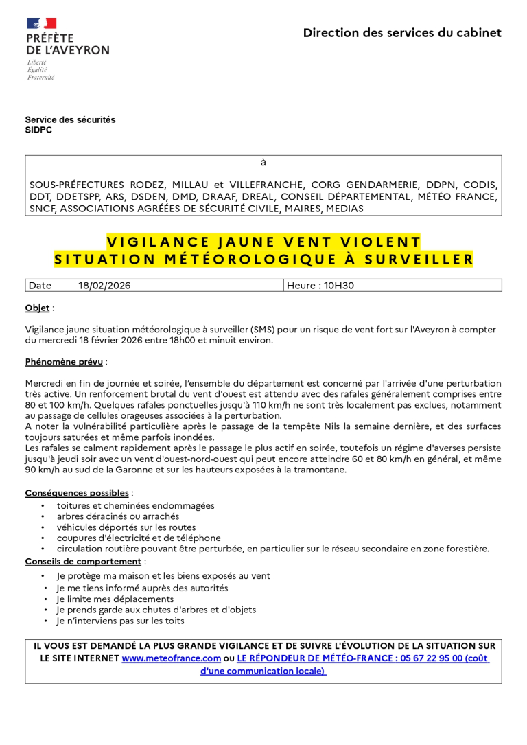 Alerte jaune météo vent violant de 18h00 à 00h00