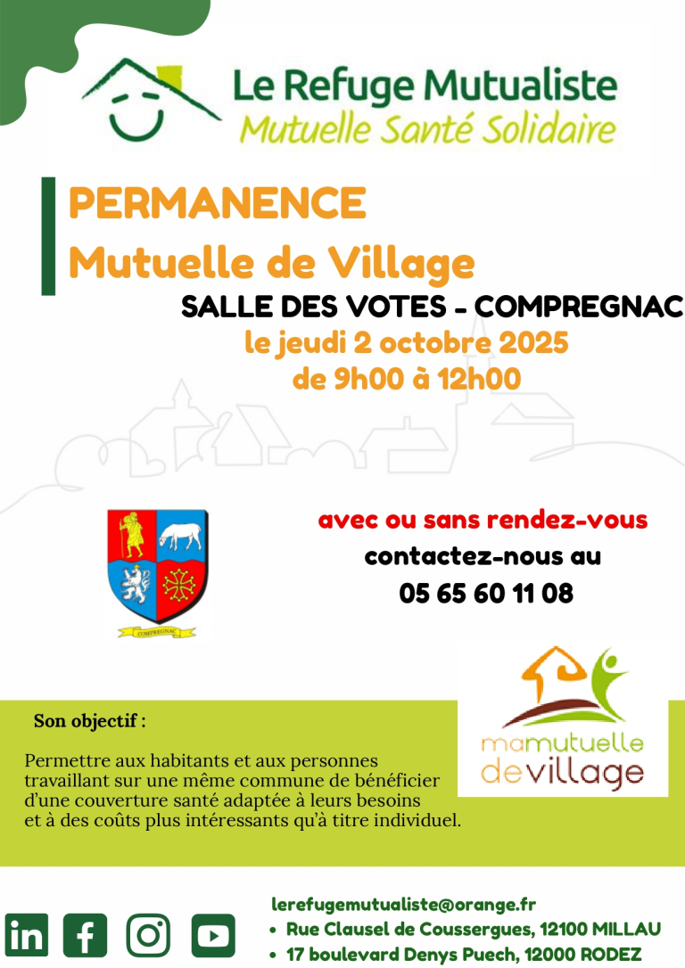 Permanence REFUGE MUTALISTE salle des votes à COMPREGNAC 02 octobre 2025 de 09h00 à 12h00